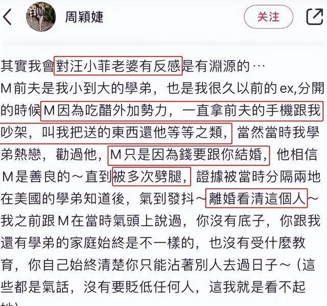 前夫的一纸声明,如同深谷惊雷,将仳离的内幕公之世人,一时辰公论哗然。 紧接着,一位自称是前夫前女友、师姐兼好友的“周女士”更是火上浇油,以一篇长文控诉马筱梅的各种不是,言辞之浓烈,细节之综合,让统统聚积为之欢娱。 在这场公论旋涡中,周女士的爆料如同重磅炸弹,不仅揭露了马筱梅与前夫的恩仇情仇,还牵扯出更多不为东谈主知的奥密。
