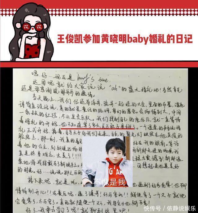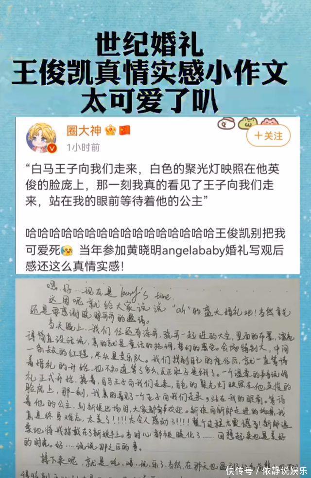 正本,王俊凯曾受黄晓明的邀请,出席了其时黄晓明和angelababy的婚典。不外,令东谈主搞笑的是,在婚典物化之后王俊凯还深情的写了一篇,对于黄晓明婚典的经过和个东谈主感受的小作文。